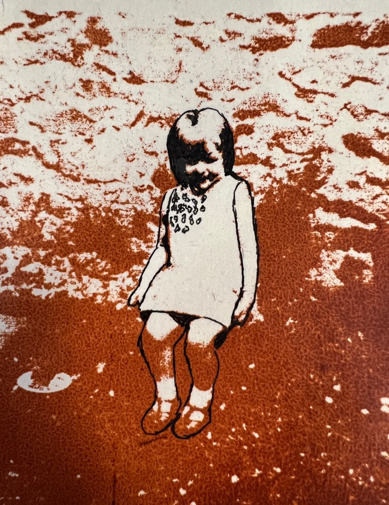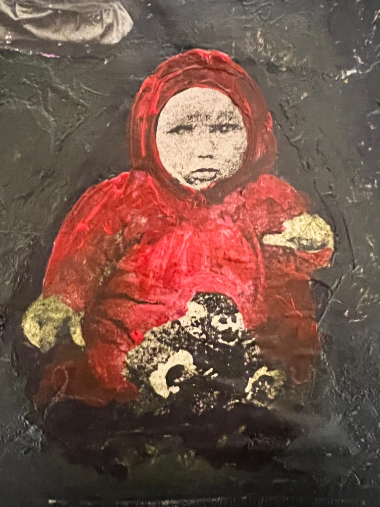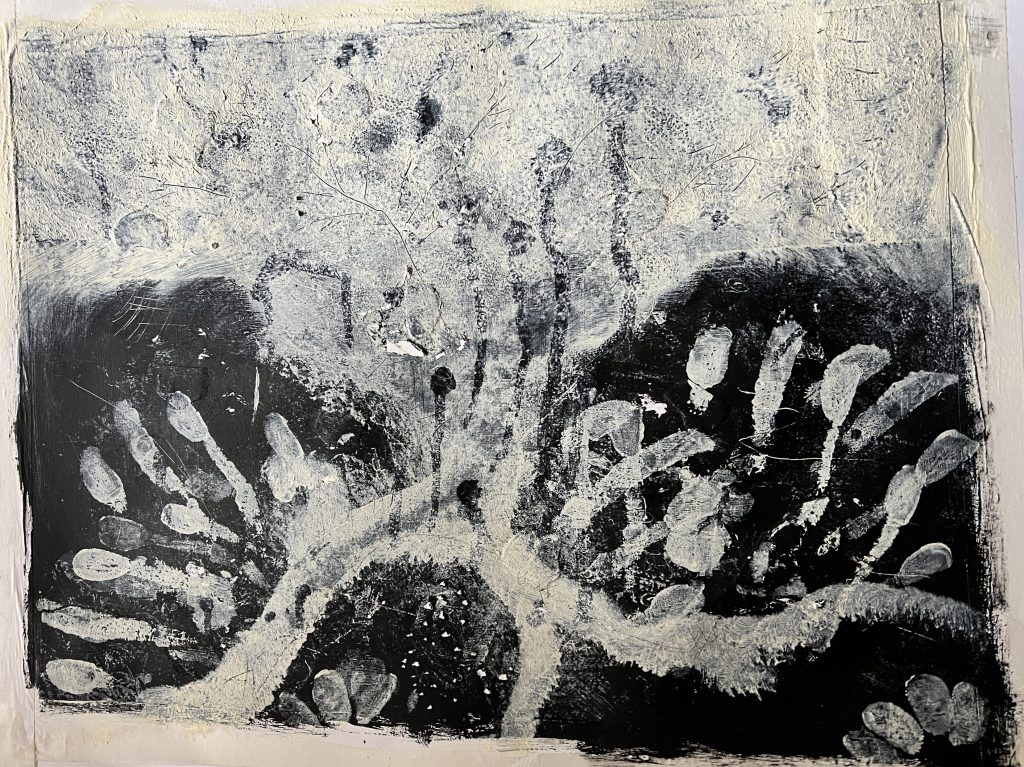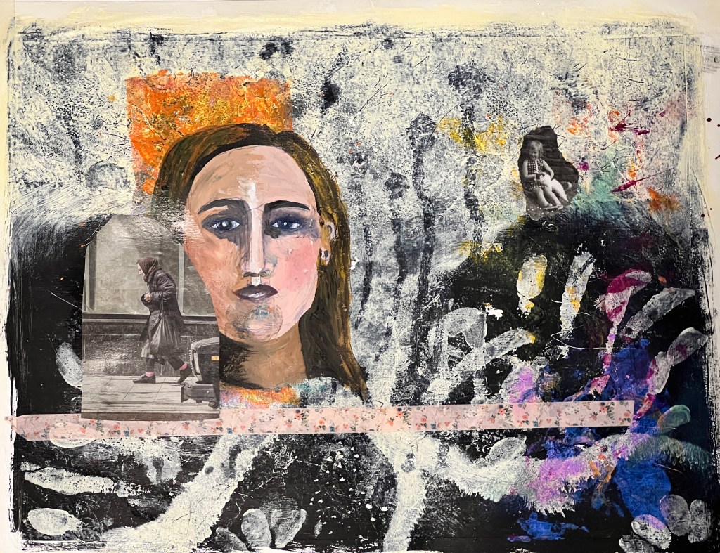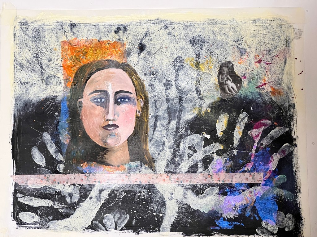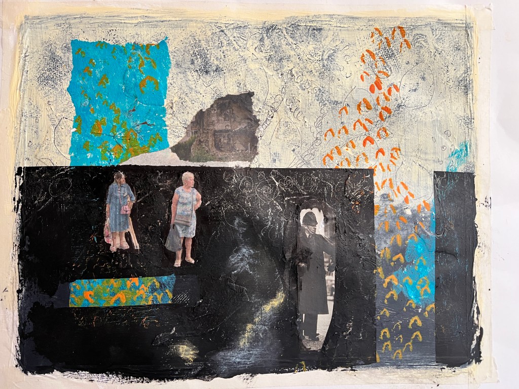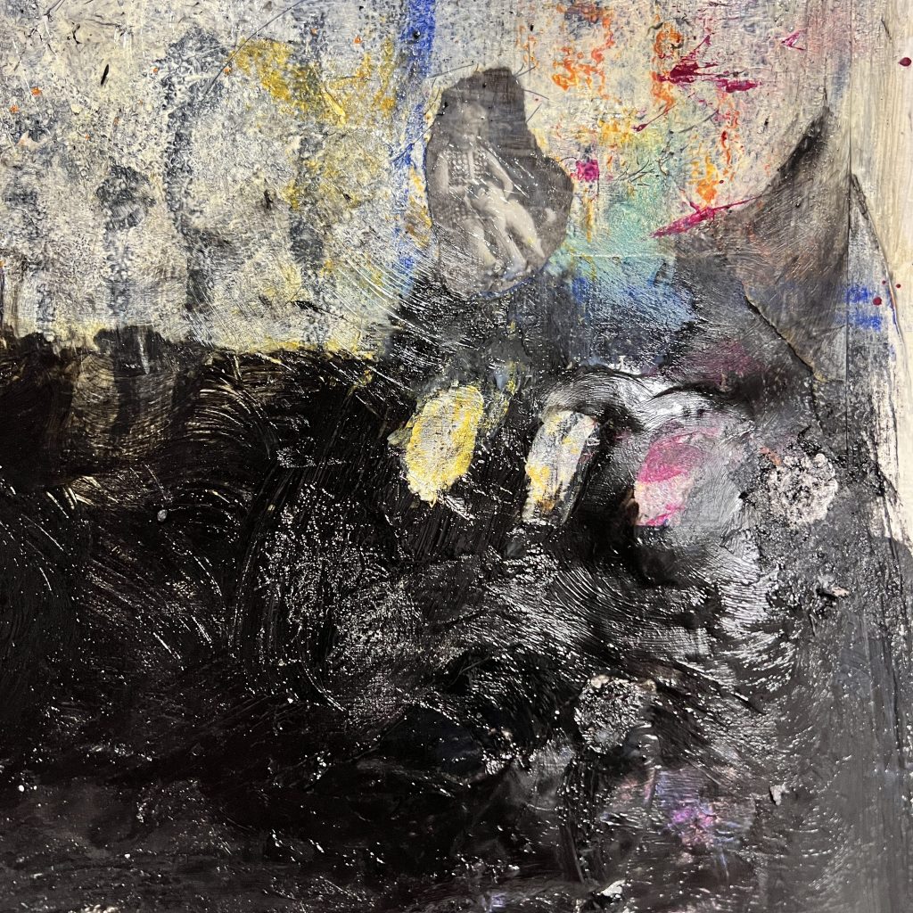 Progression of my painting from laying down three layers of white gesso and mixed media found materials to add texture, adding a layer of black acrylic paint, and marking in to it. I then added an off white layer masking off the lower part, and working some white into the black with my fingers, this was a joyous free feeling to use my fingers to paint. Further masking to add colour blocks. I found that I had added the mixed media layers too late and using PVA and this lifted off when I put pain over the top so I had to experiment a little at this stage. I decided to paint a figure into this landscape and took a long time to paint all the details, I let it dry and It did not sit right at all (second image). I added collage and began to cover the painting, it was at this stage that I began to struggle with the process, covering areas with collage and paint splattering colour and taking away the tightness of the previous painted face, the images I have used was myself with my childhood cat and an old lady in an article about the hardships the Russians are also facing due to the war in Ukraine, her posture, her clothing, reminding me of someone from my past. Picture 4 i began to re add the black, Picture 5 is a close up of the detail on the right of the painting where I have left the underneath layers of fingerprints as cocoons of details. Picture 6 I added more colour to cover the face, the Large picture is the finished painting.