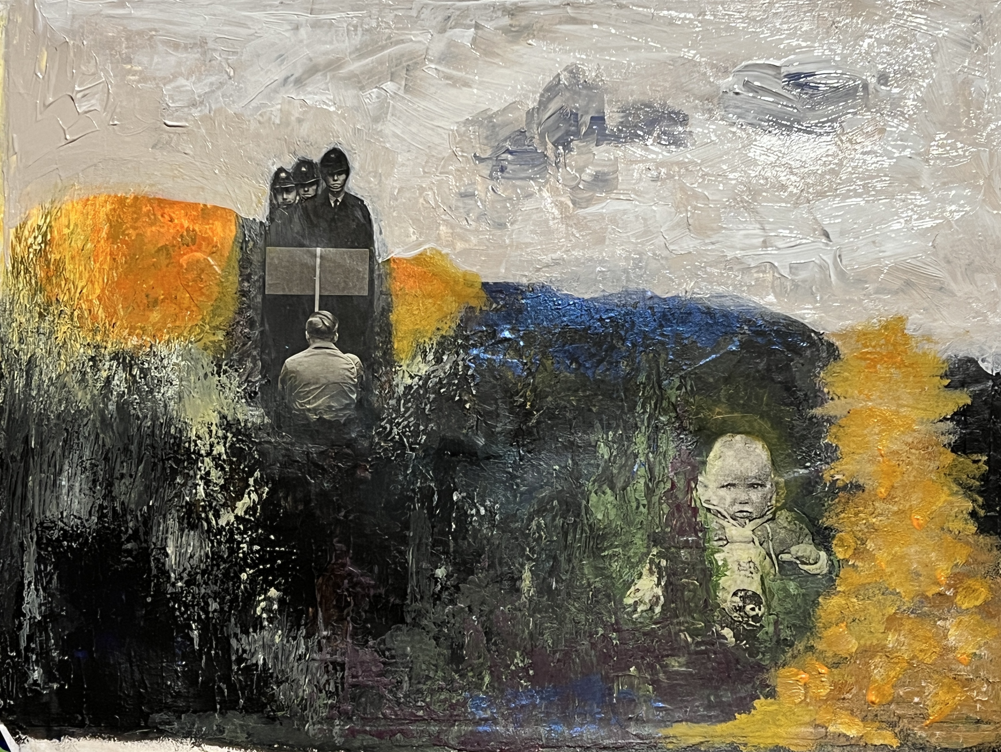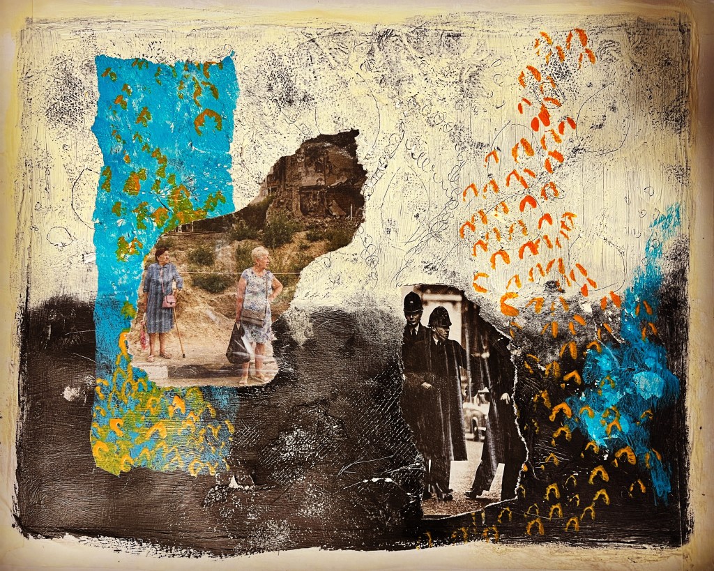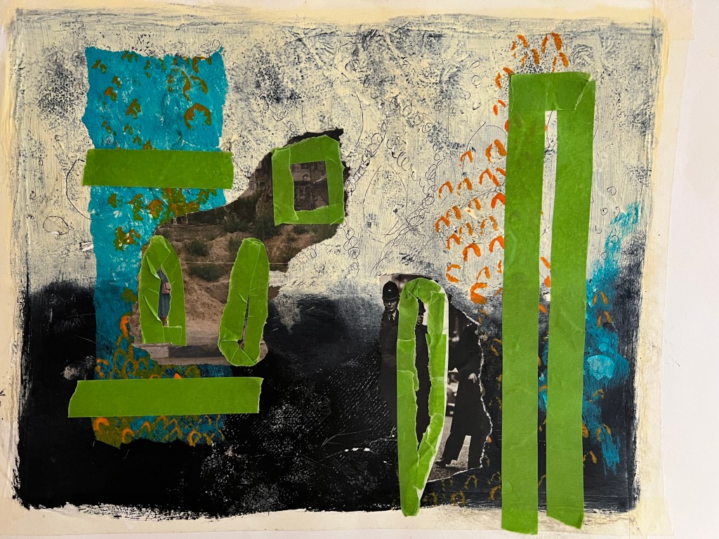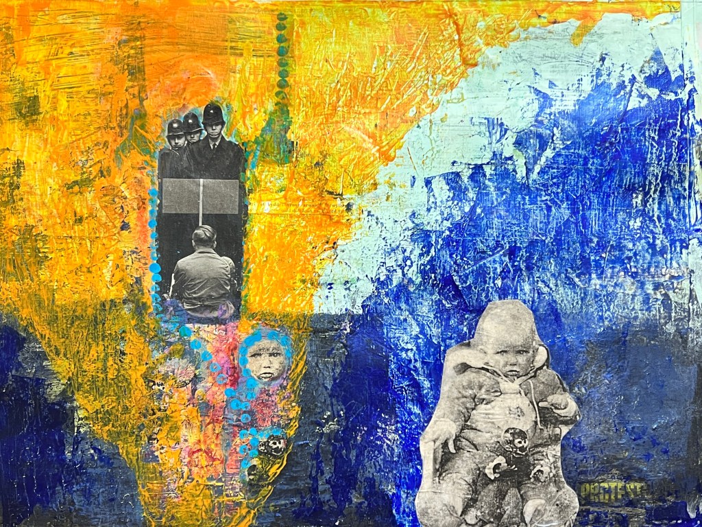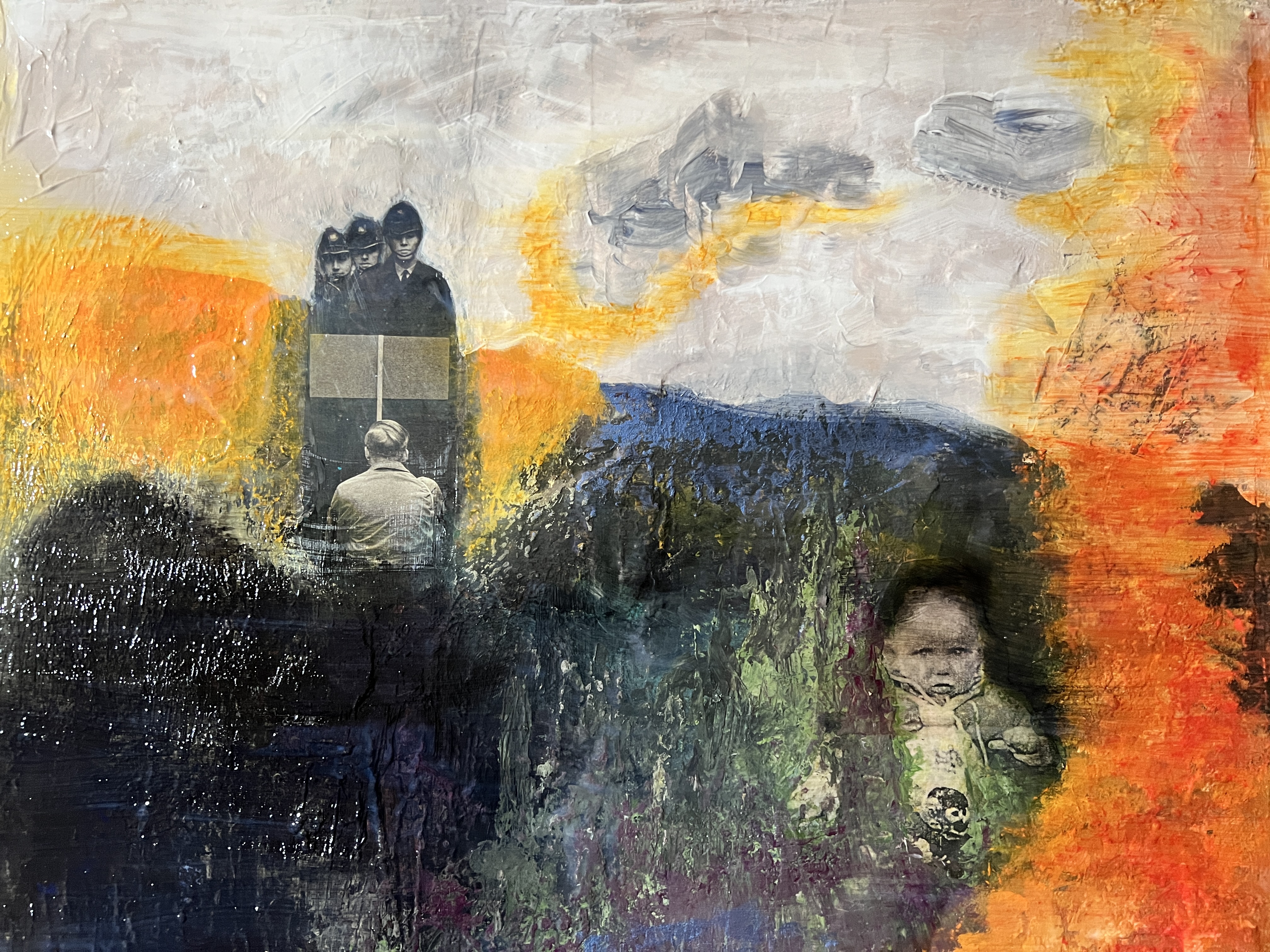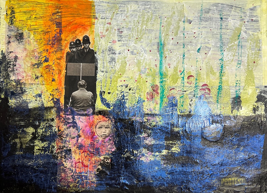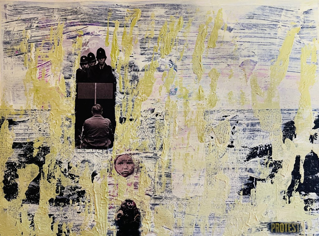 My second painting showing my process, how I have applied the layers, my application of exploring my trauma narrative, the collage from newspaper magazine was a piece about protest the Police man is one from my childhood. In the news there has been a lot of press about extinction rebellion, climate catastrophe, as well as the ongoing Ukrainian war and the cost of living crisis, these feed into my thinking and my artwork. With a mix of my historical narrative, growing up in a then dysfunctional family Blaenau Ffestiniog’s damp rain slate slag environment with little optimism, with the highest rate of suicide in the country. These were my thought processes whilst painting this, the colours particularly.
