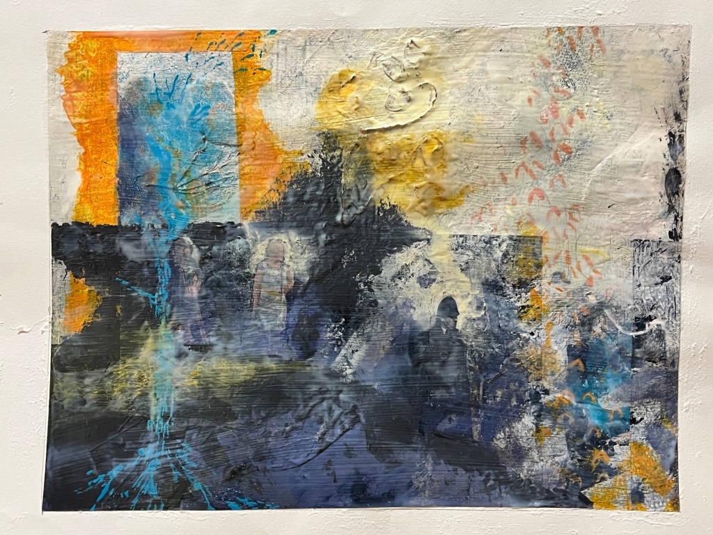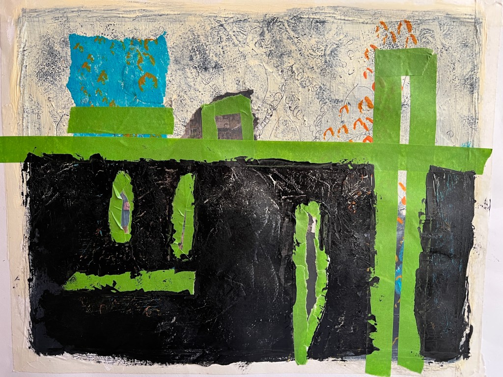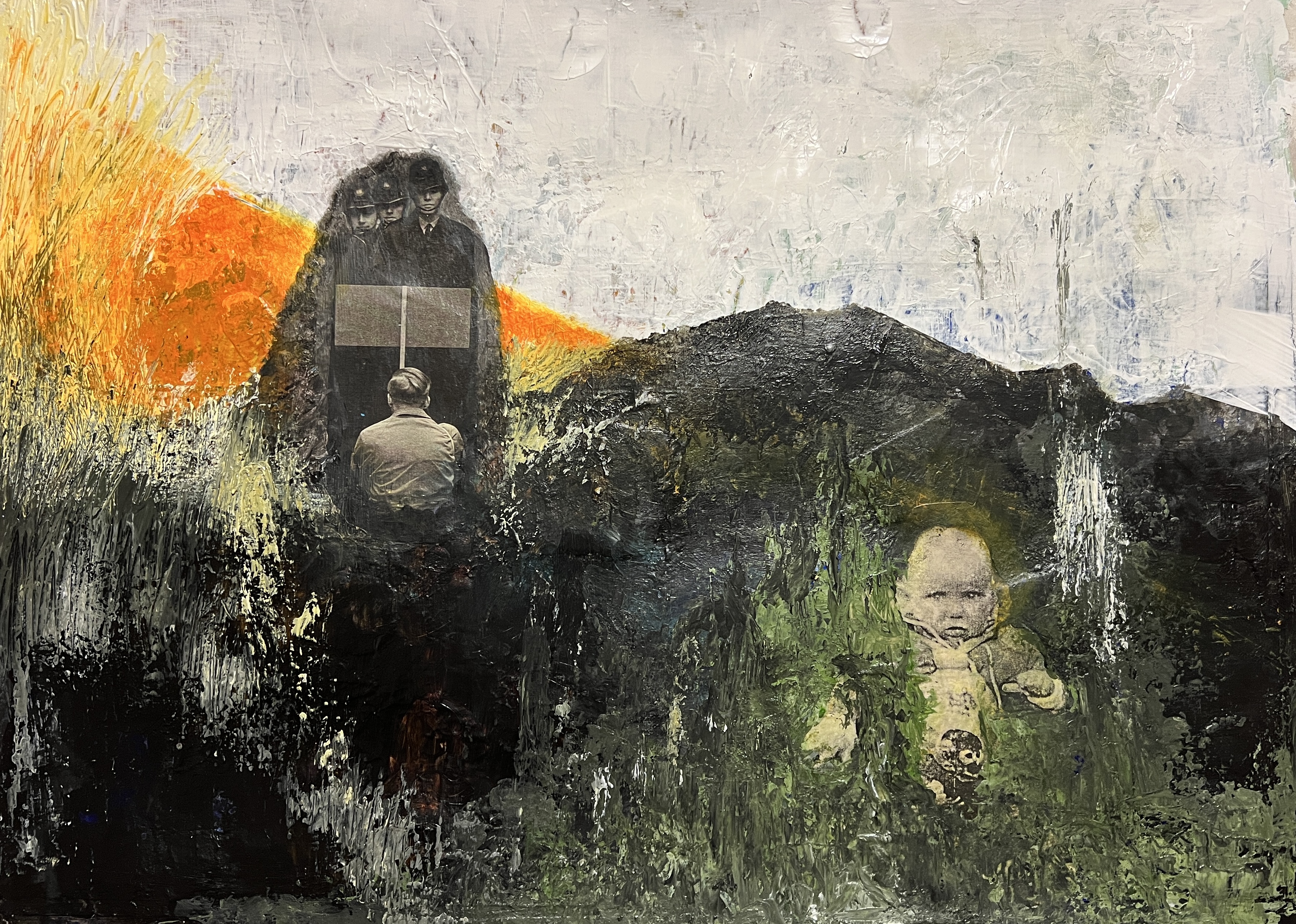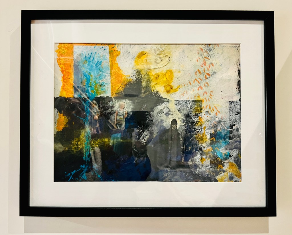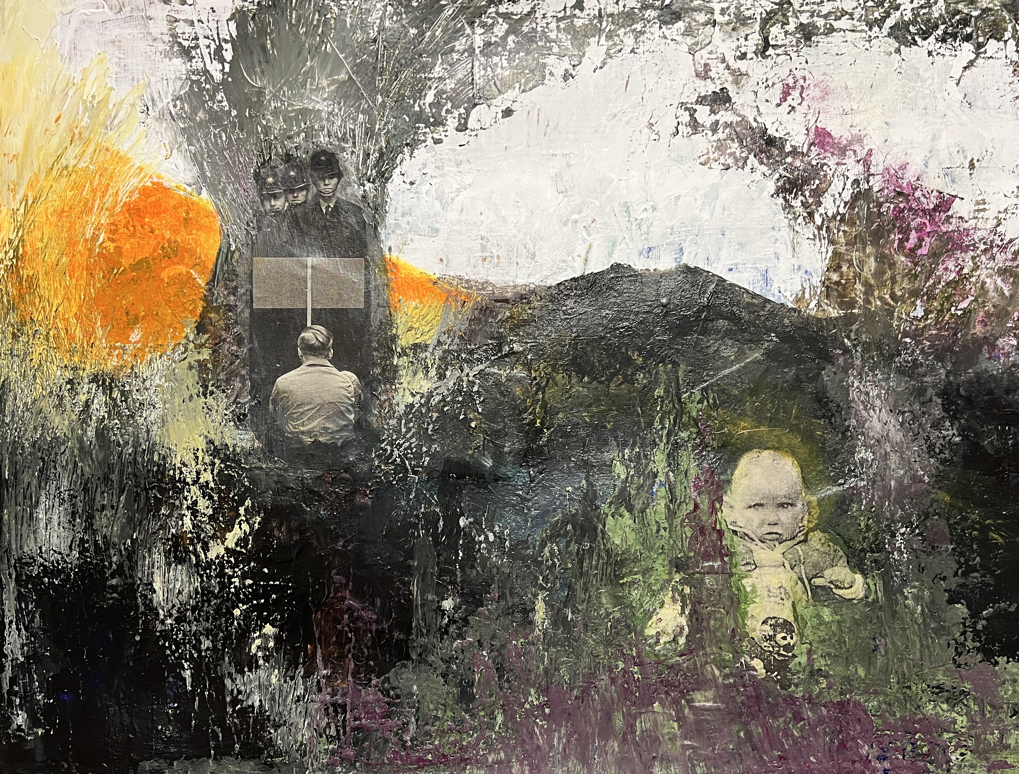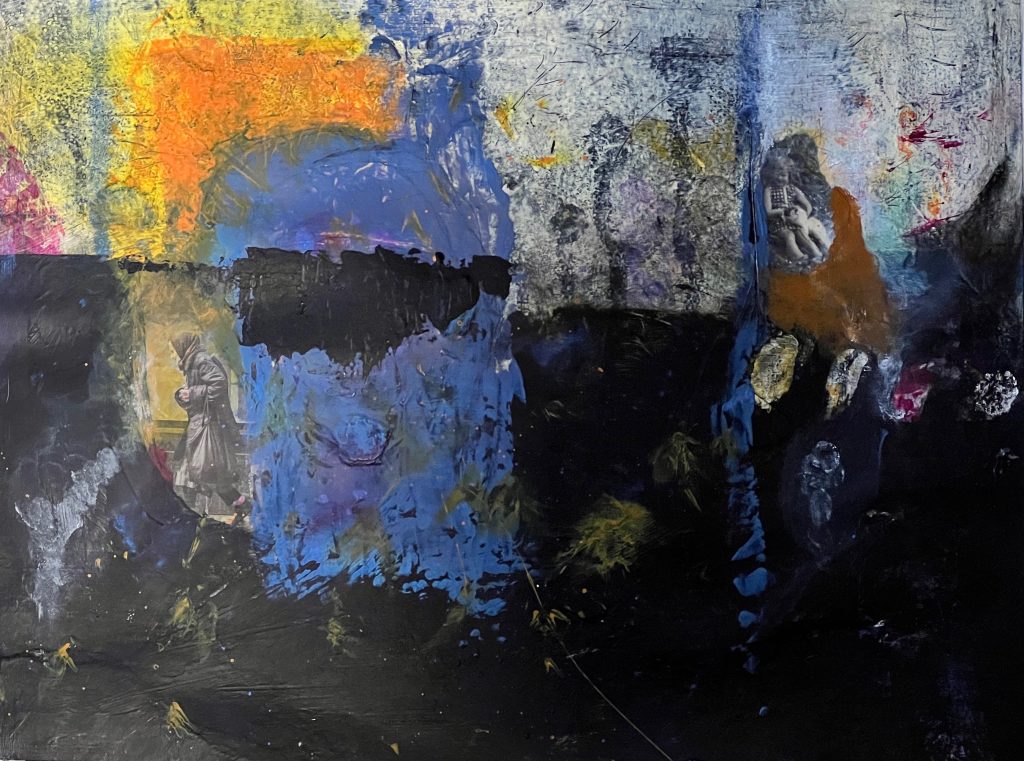 My second painting showing my process, how I have applied the layers, my application of exploring my trauma narrative, the collage from newspaper magazine was a piece about protest the Police man is one from my childhood. In the news there has been a lot of press about extinction rebellion, climate catastrophe, as well as the ongoing Ukrainian war and the cost of living crisis, these feed into my thinking and my artwork. With a mix of my historical narrative, growing up in a then dysfunctional family Blaenau Ffestiniog’s damp rain slate slag environment with little optimism, with the highest rate of suicide in the country. These were my thought processes whilst painting this, the colours particularly.