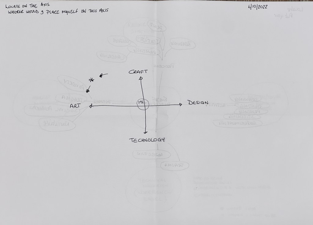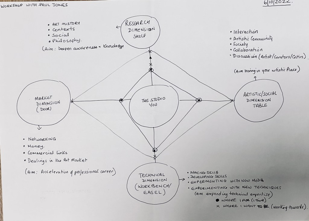 This workshop was really helpful to understand where I am as an artist, what my discipline is, where my strengths are. I had not considered these questions as a whole, I have concentrated on my art practice, the who, the what and the why of my practice rather than the inward looking that I have done over the summer, on reflection this has also been useful, but looking at the final picture above, I can see my artistic skills as a whole. My conclusion to the workshop is that I need all of these areas to continue to practice as a successful artist as I feel that they feed into each other.