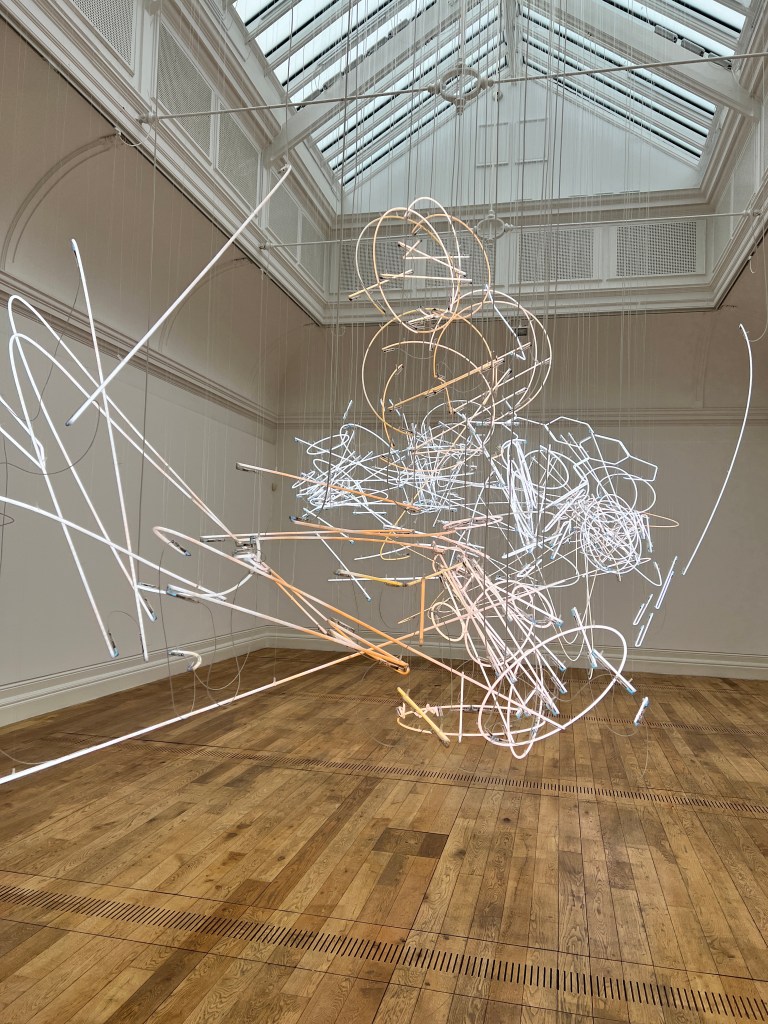 Cerith Wyn Evans’s exhibition was visually stimulating, he used intricate fluorescent tubes hung from the celling of the gallery in such a way that it looked like a magical sky scribble, the steward explained how the work had arrived with a map for the floor as a diagram of instructions to be able to hang, this in itself was impressive, he also had car windscreens hung with smashed pieces into them which reflected the light beautifully. I am glad I went and made a connection.