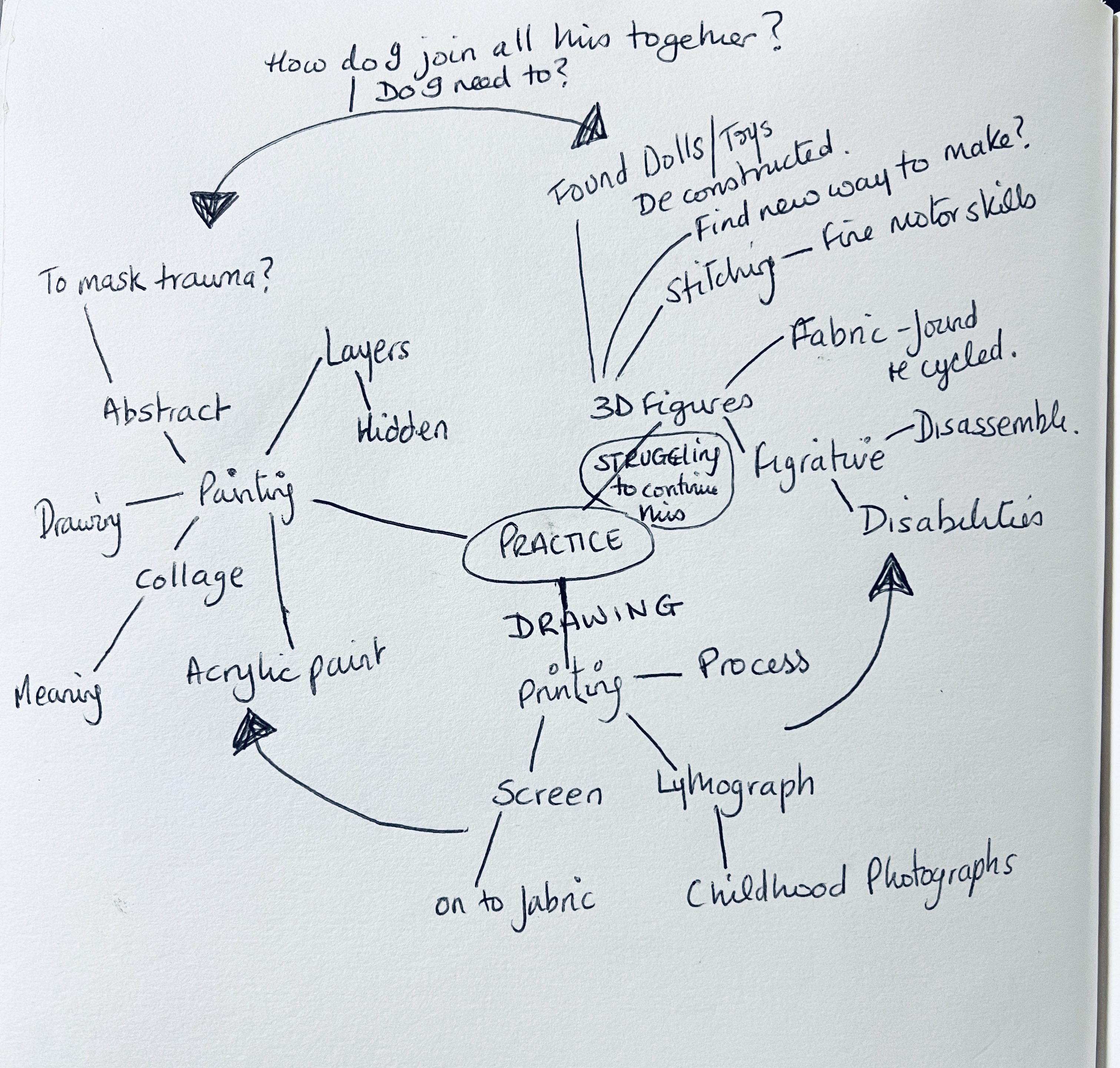 One of my initial mind Maps, changing my media to continue to express myself and my narrative, searching for answers on how I join everything together, My starting point is to paint, it is to explore if by painting I can express the same narrative through this medium. Layering has always been present, not just in a practical sense with fabric and stitching but in an emotional manner, layering narrative to form a protective barrier. My challenge is to marry my processes together, or at least explore if it is possible to find a way to do this using my figures, printing and painting or possibly as Gareth Griffiths has, they are all part of my process, they do not need to be married together?