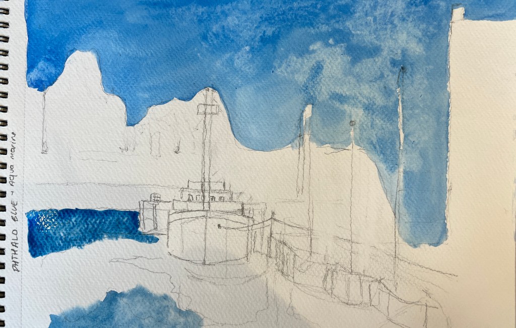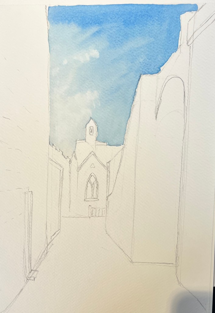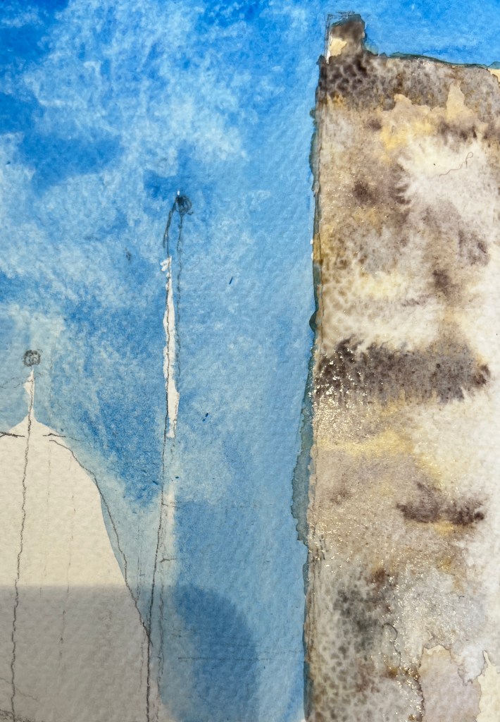 I decided to do this course despite my not using watercolour as a medium, but felt that I would gain insight to transfer into my practice, colour mixing, composition, vanishing point, painting, drawing from life as opposed to from a picture. It feels very much like a directed class, it is only two hours every week for x 6 weeks. I have learnt about the application of wet on wet and how the paint can cauliflower, it has given me a huge respect for watercolour artists, it is not an easy medium where you have to apply the lightest areas first leaving the white areas blank. Doing the course has enabled me to realise that I will not be specialising in Watercolour Painting, but the course has moved my painting forward.