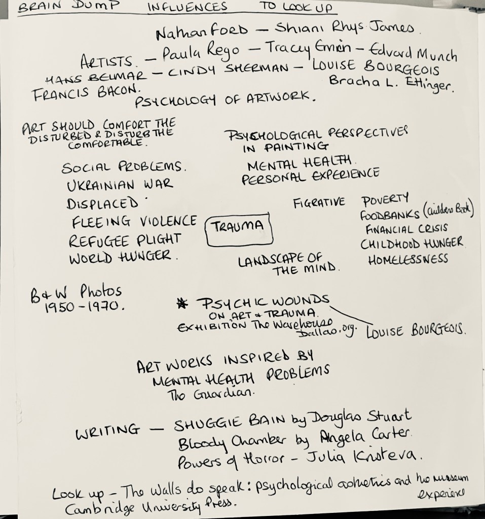 My research led me to an exhibition which took place in February 2020 called Psychic Wounds, on art and Trauma, the exhibition guide includes essays, images of the works of art featured and it also has an online website thewarehousedallas.org the show was curated by Gavin Delahunty. There are so many pieces of art in this collection that I am inspired by, emotionally identify with and I will discuss these further as my research evolves.