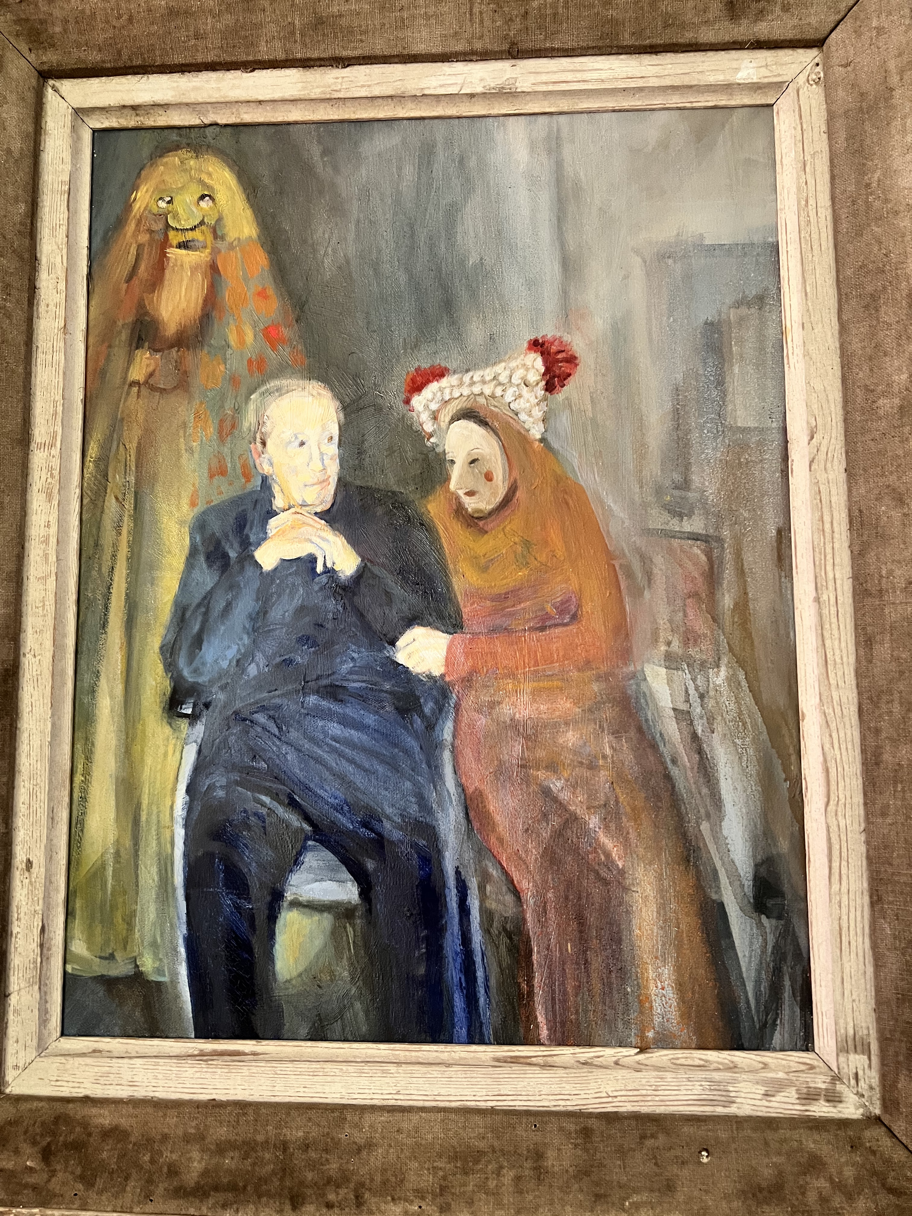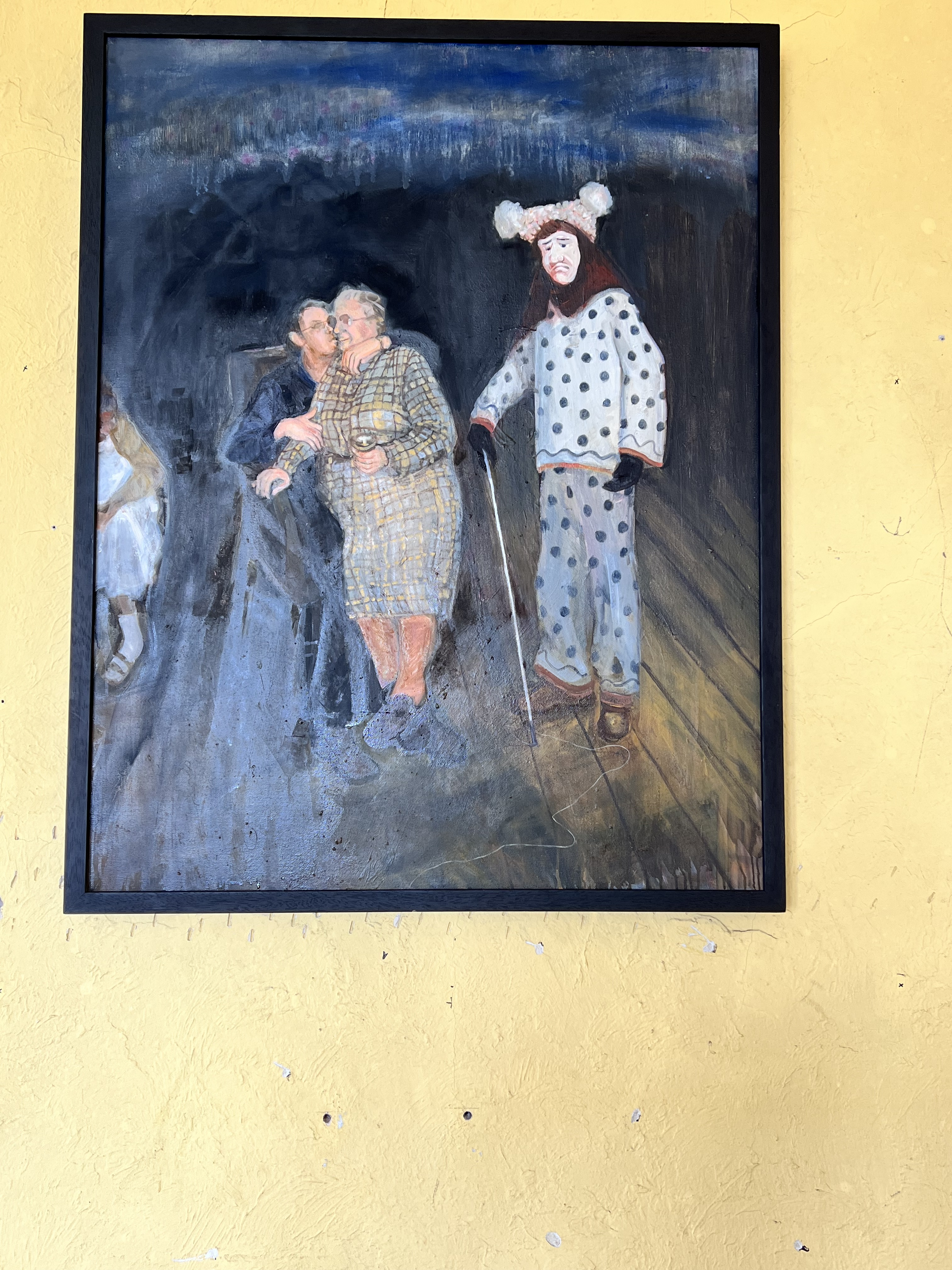 “Many Residents at the Plas Bodfa care home had dementia, confused about place and time. These paintings imagine the liminal space they inhabited, using strange costumed figures from First Nacht to enter into these alternative realities. Are they psychopomps, signaling the journey to the next world?” (https://www.plasbodfa.com Karen Birkin