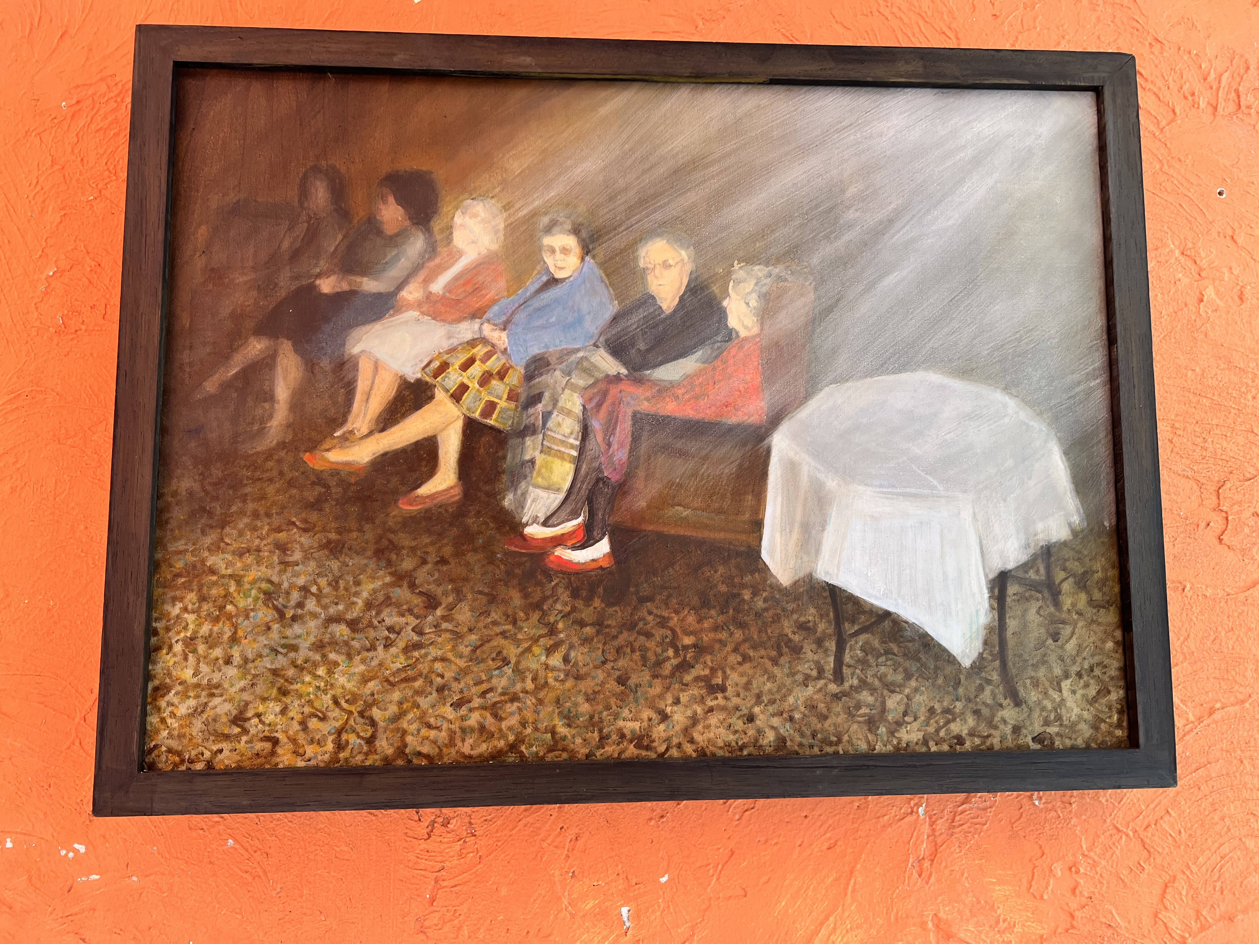 What stayed with me was Karen Birkin’s paintings “And the walls became the world all around” 2020-2022 oil on canvas. From a personal perspective, having worked with the elderly and individuals with dementia, I found the paintings extremely moving, painting individuals in their care home setting some at the end of their lives in such a beautiful and poignant way, quite often I feel they are the overlooked in our society, as I get older I see myself disappearing from view, especially in a world filled with social media where being 35 is considered old. The first painting of the person in the wheelchair looking out of the window is haunting, the second is a colourful masterpiece and depicts the carpet pattern I remember the scene could be of two older ladies but then one has no shoes on which made me smile, individuals with dementia would often take their shoes off.
